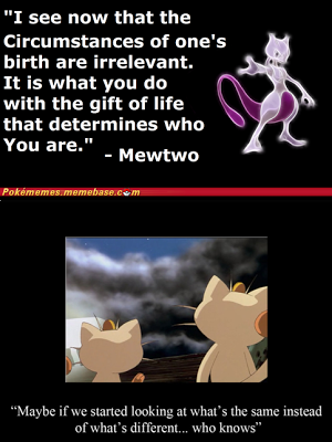 O primeiro filme, Mewtwo Strikes Back / Mewtwo Contra-Ataca, foi o que vi mais vezes. A história é interessante e o vilão, Mewtwo, é um vilão entre aspas pois uma pessoa é capaz de compreender, em certo grau, algumas atitudes dele. No entanto, apesar de, no fim, passar uma boa mensagem para o público infantil - semelhante à do Harry Potter: o que conta não é a forma como nascemos mas sim aquilo em que nos tornamos - o filme torna-se demasiado pesado, demasiado sombrio para uma criança, na minha opinião, com poucos momentos divertidos para aligeirar. Por exemplo, a cena em que o Pikachu tenta reanimar Ash - não se percebe se ele estava mesmo morto, durante muito tempo assumi que ele estava apenas petrificado... adiante - só se compara à cena em que Simba tenta acordar o pai morto; só que O Rei Leão tem uma mão-cheia de momentos alegres para contrabalançar.