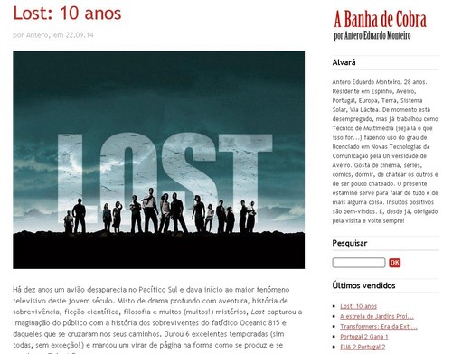 Assim sendo, o primeiro blogue que quero divulgar é o Banha de Cobra, de Antero Eduardo Monteiro, que já sigo há alguns anos e que foi uma das minhas inspirações para começar a escrever críticas, sobretudo a filmes e séries. Gosto muito daquilo que o Antero escreve, apesar de não concordar com várias das suas opiniões. Partilho convosco uma das suas melhores e mais hilariantes crónicas.